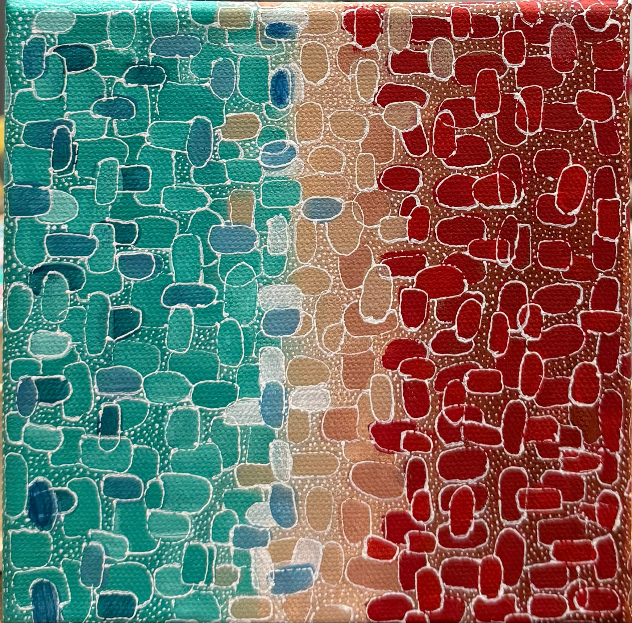 DESCRIPTION: A miniature yet vivid exploration of the raw colours of our Kimberley coast, this abstract work captures the region’s striking and unique palette. Fiery red orange cliffs contrast dramatically with turquoise waters and warm sunbaked sands.